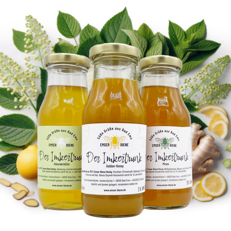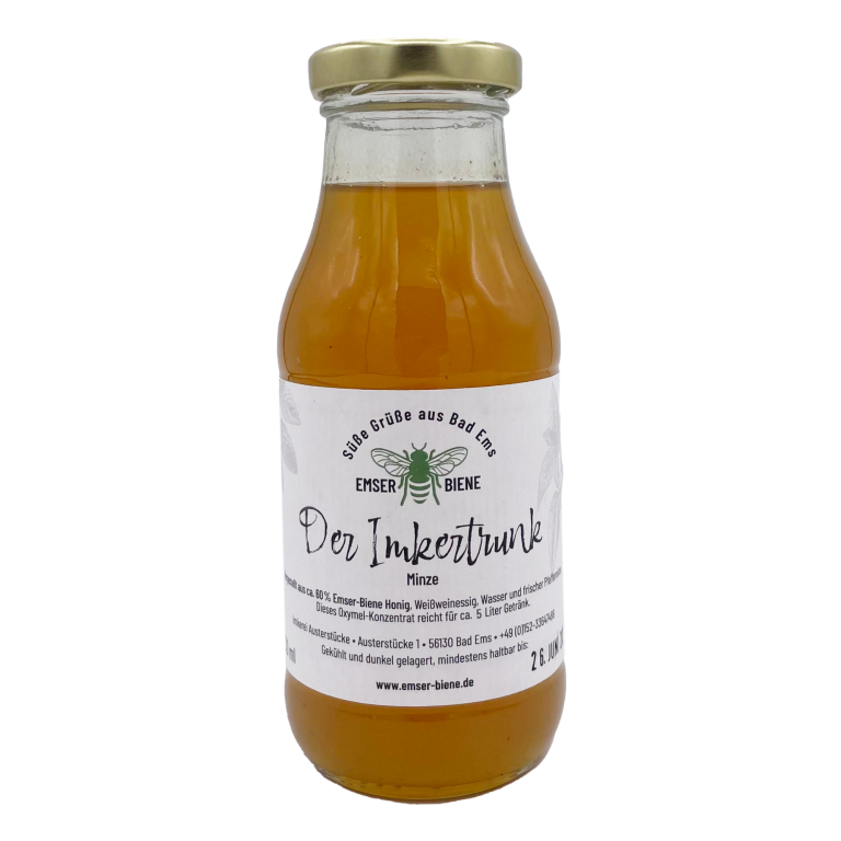 Oxymel hergestellt mit ca. 60 % Emser-Biene Honig, Weißweinessig, Wasser und frischer Pfefferminze aus den Austerstücken.