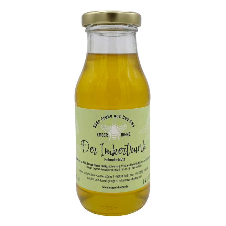 Oxymel hergestellt mit ca. 70 % Emser-Biene Honig, Apfelessig, frischen Holunderblüten aus den Austerstücken, Bio-Zitronenschale.