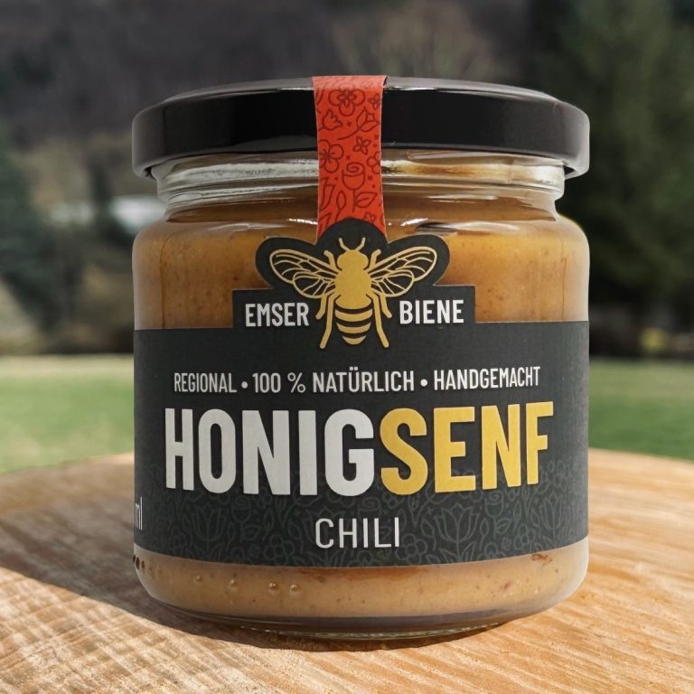 Für alle, die es feurig würzig mögen – unser Chili-Honigsenf. In der Senfmanufaktur in der Vulkaneifel handwerklich hergestellt, bringt dieser Senf eine angenehme Schärfe von Chili und Senf mit. Honigsenf wird ohne Zucker hergestellt, nur mit Emser Biene Honig.