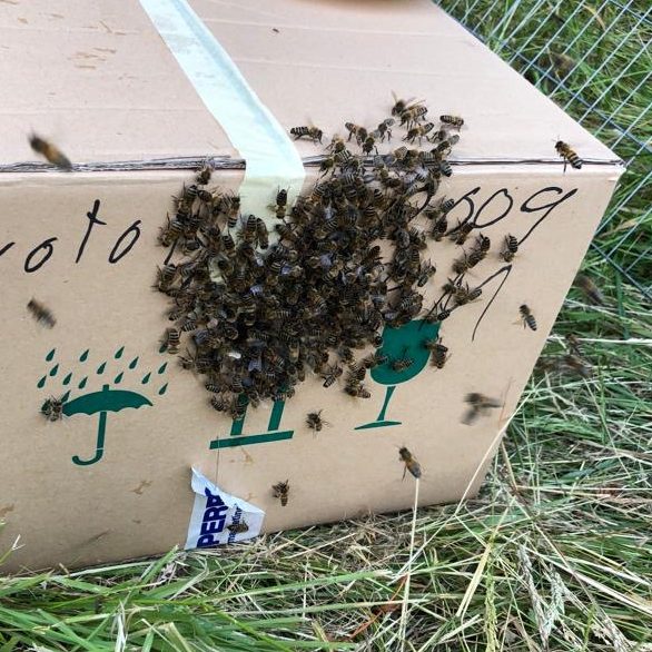 Nachdem wir den Schwarm erfolgreich in einer Kiste eingefangen hatten meldete sich der Imkerverein Bad Ems und bot uns Hilfe an. Am nächsten Tag besuchte uns ein Imker des Vereines und mittlerweile guter Freund der uns half den Bienen ein richtiges Zuhause zu geben.