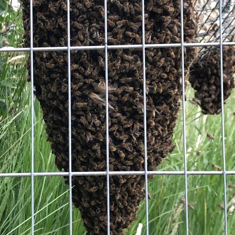 Es war im frühen Sommer, da passierte es. Ein riesiger Schwarm Bienen flog über die Austerstücken und hing plötzlich nach einem Zwischenstopp im hohen Kirschbaum nun im gerade leer stehenden Kaninchengehege.